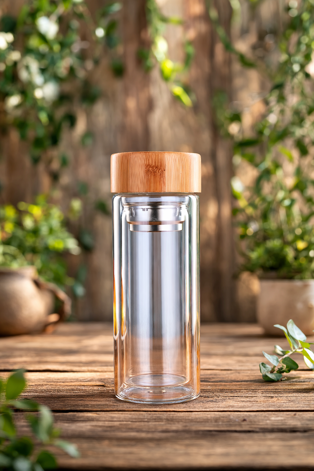 בקבוק זכוכית אלגנטי ואיכותי המיועד לחליטת תה, צמחי מרפא או פירות – בבית, במשרד או בדרכים. הבקבוק עשוי זכוכית עמידה עם דופן כפולה השומרת על הטמפרטורה ומאפשרת ליהנות ממשקה חם או קר לאורך זמן.